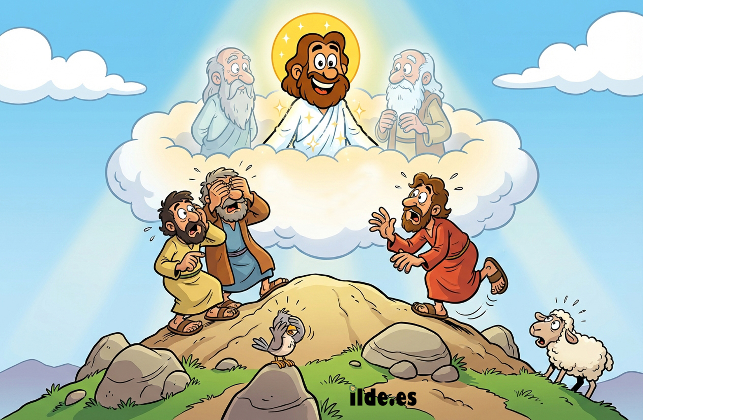 Un día, Jesús subió a una montaña para rezar. Llevó con Él a tres de sus amigos: Pedro, Santiago y Juan. Allí arriba, mientras Jesús oraba, algo muy especial ocurrió. El rostro de Jesús empezó a brillar como el sol y su ropa se volvió blanca y luminosa. Los discípulos se dieron cuenta de que Jesús no era solo un maestro, sino el Hijo de Dios.