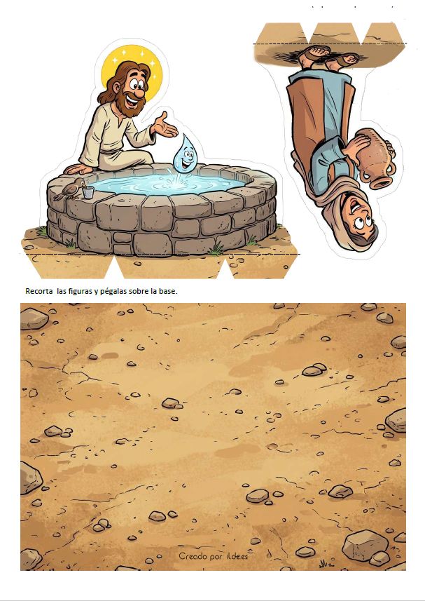 Cada etapa incluye el Peque Evangelio, adaptado a su lenguaje, y una actividad que conecta directamente el texto evangélico con un gesto concreto. La cruz inicial, el desierto, la luz del monte, el pozo, la curación del ciego y la resurrección de Lázaro no aparecen como escenas aisladas, sino como estaciones de un mismo itinerario espiritual.